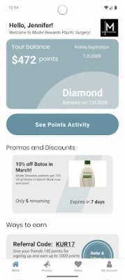 Within the Model Rewards app, each patient is assigned a unique Referral Code. The patient Referral Code can be sent to friends by playing 'The Referral Game', where patients can win points once their referred friends purchase services. As a second option, patients can simply provide friends their Referral Code to use at login to the Model Rewards app. The referred patient will receive points immediately upon login and the referring patient receives points once the referred patient books their first service.