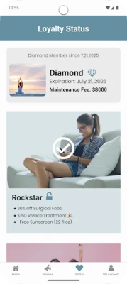 Rewards and Loyalty Status are viewed and tracked within the Model Rewards app. Patients can view the number of points they have accumulated as well as track their progress towards their next Loyalty Status. Furthermore, patients can view the prizes they may be eligible for by achieving each respective Loyalty Status.