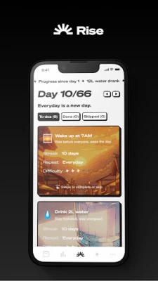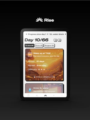 Struggling with motivation or direction? Rise offers a personalised 66-day program to help you reset your life. Tailored to individuals seeking purpose and a fresh start, Rise is more than an app—it's a companion on your journey to self-improvement.