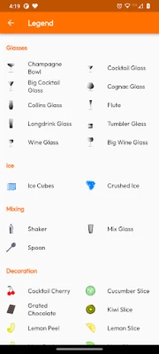 The app contains non alcoholic and alcoholic recipes, displays them in a compact list including expressive icons for glasses, ice, mixing type, decoration. The app does not feature cocktail images and is intended as mnemonic listing for bartenders in their daily job. The aim is to display the cocktail that are available to your inventory in a reduced and easily navigable setting.